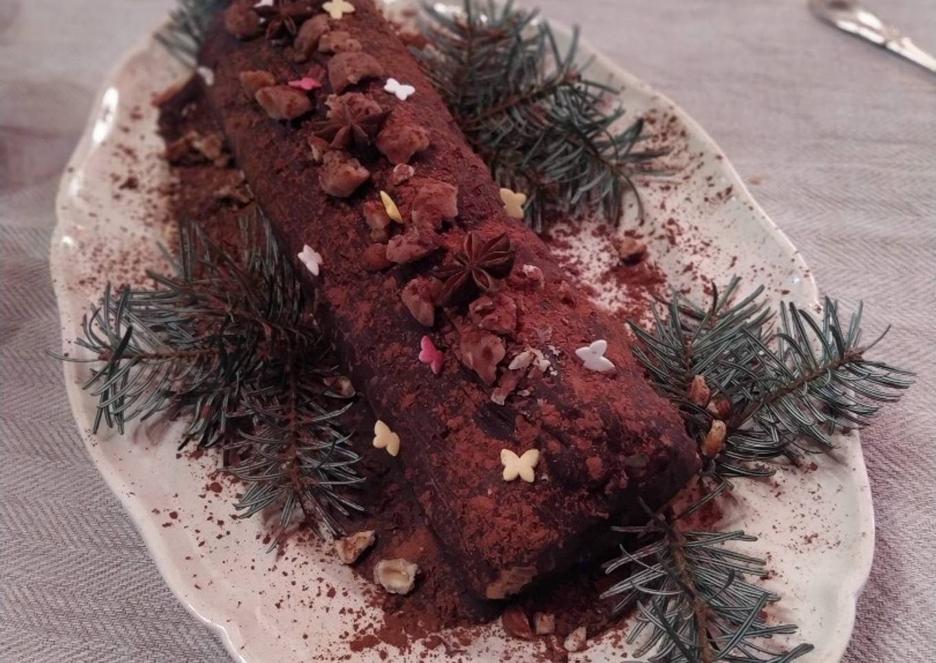 Lorsque le nappage est un peu refroidi, passer avec une fourchette sur la bûche afin de créer l’illusion de l’écorce d’une bûche. Saupoudrer à l’aide d’un chinois le cacao amer, puis décorer avec les brisures de marrons glacés, du sucre glace, des figurines, branches de sapin, ….