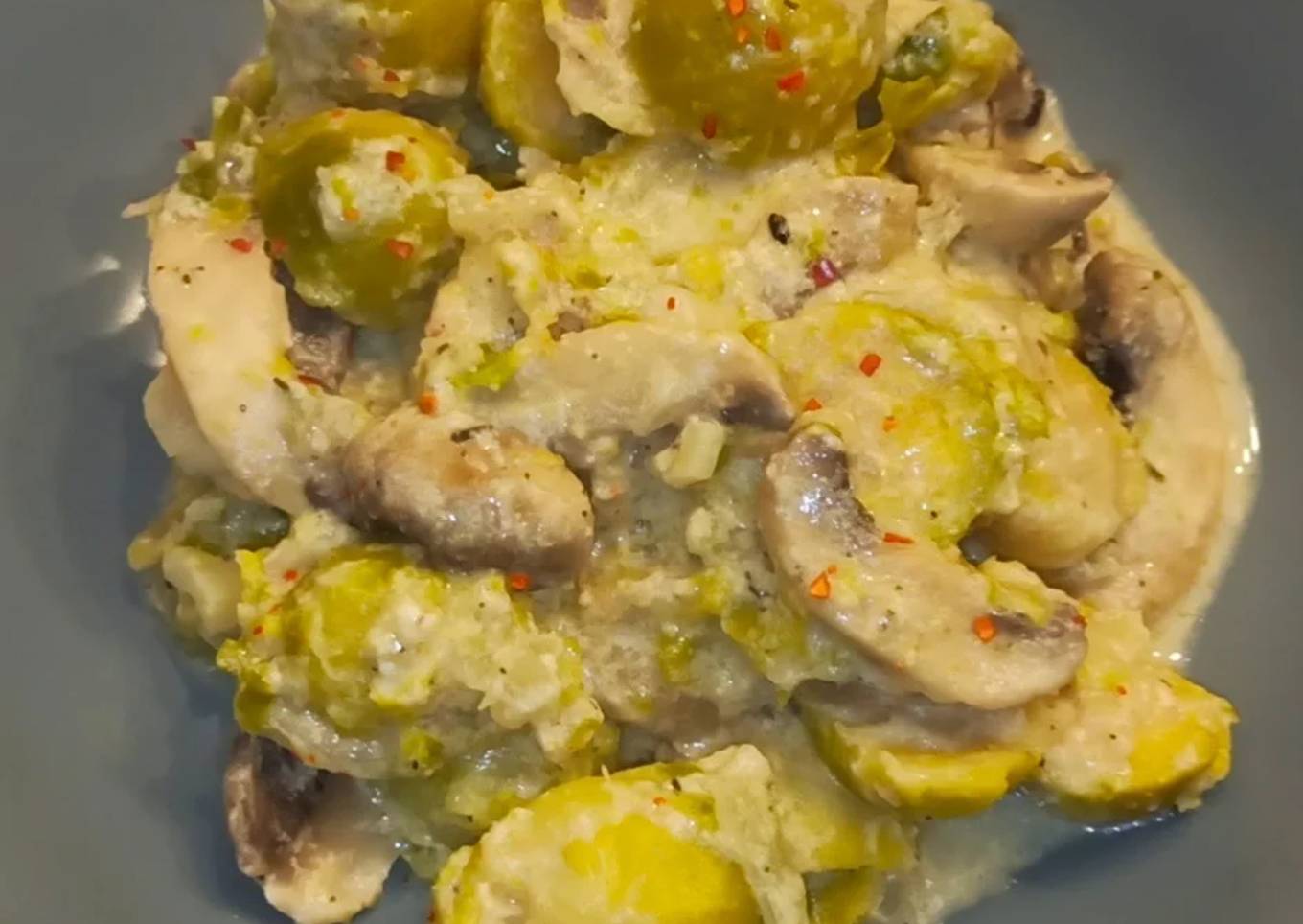 Choux de Bruxelles, champignons sautés sauce ail et parmesan