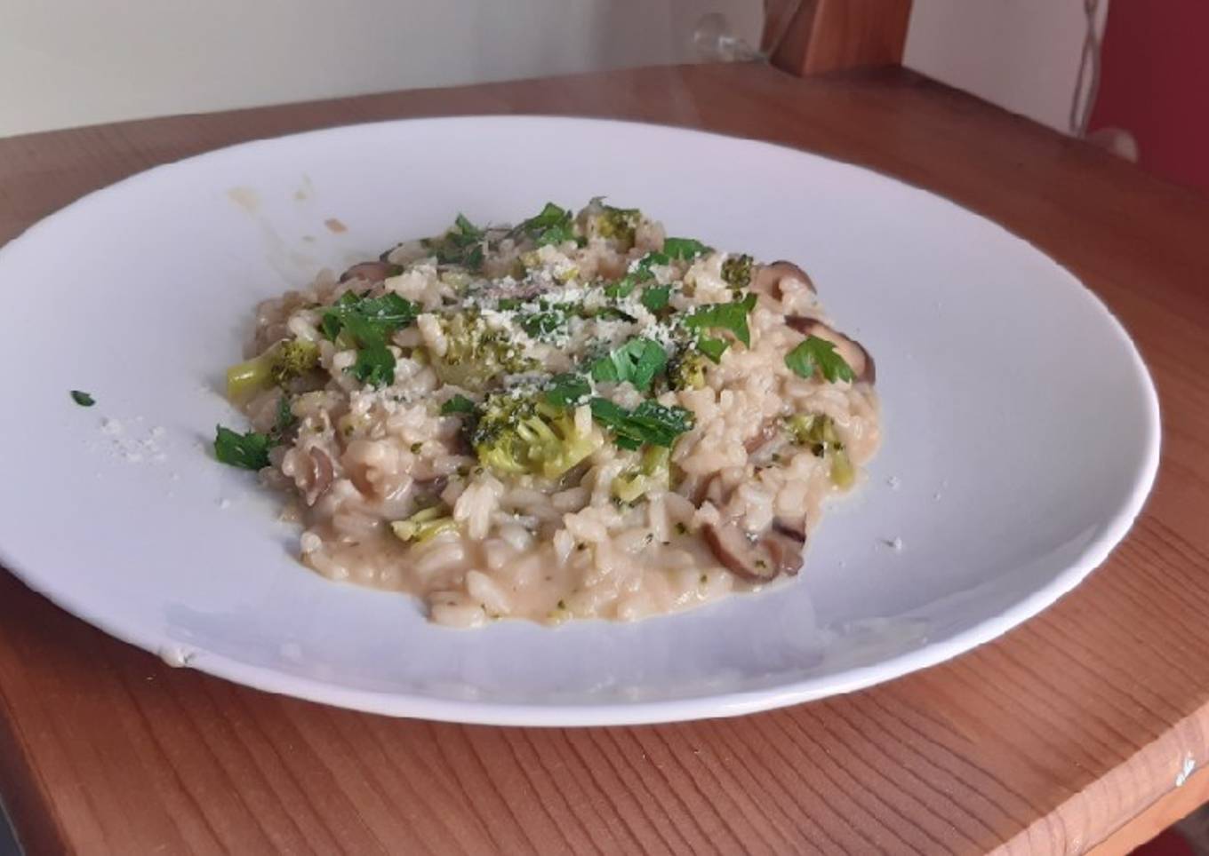 - Faites cuire le tout dans le bouillon en remuant régulièrement. Rajoutez du bouillon quand ça réduit. La cuisson devrait prendre 15-20 min, vérifier en goûtant le riz. A la fin, ajoutez un peu de parmesan et remuez. Quand le riz est bien cuit et que le bouillon a réduit pour être crémeux c'est le bon moment pour servir !