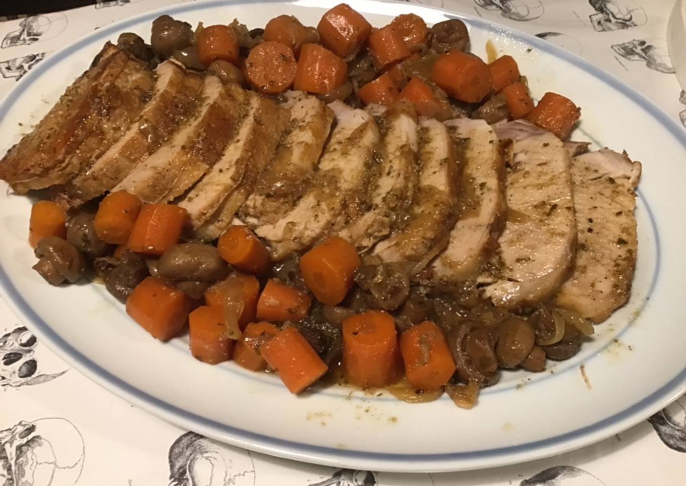 Rôti de porc en cocotte aux carottes,oignons et champignons (cuisson au four)